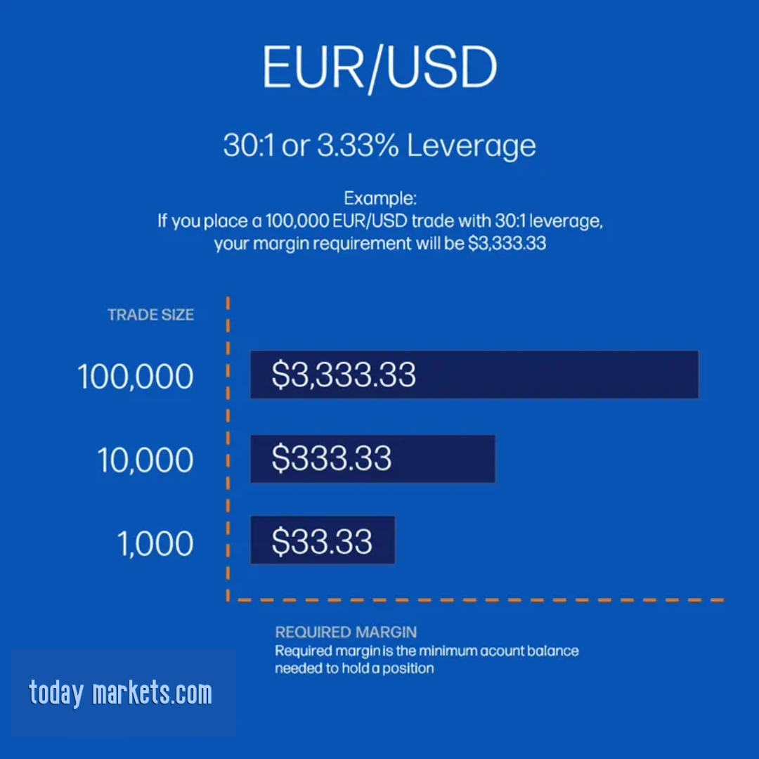 Let’s look at a typical EUR/USD (Euro against US dollar) trade. To buy or sell a 100,000 of EUR/USD without leverage would require the trader to put up $100,000 in account funds, the full value of the position. But with 30:1 leverage (or 3.33% margin required), for example, only $3,333.33 of the trader’s funds would be required to open that $100,000 EUR/USD position.