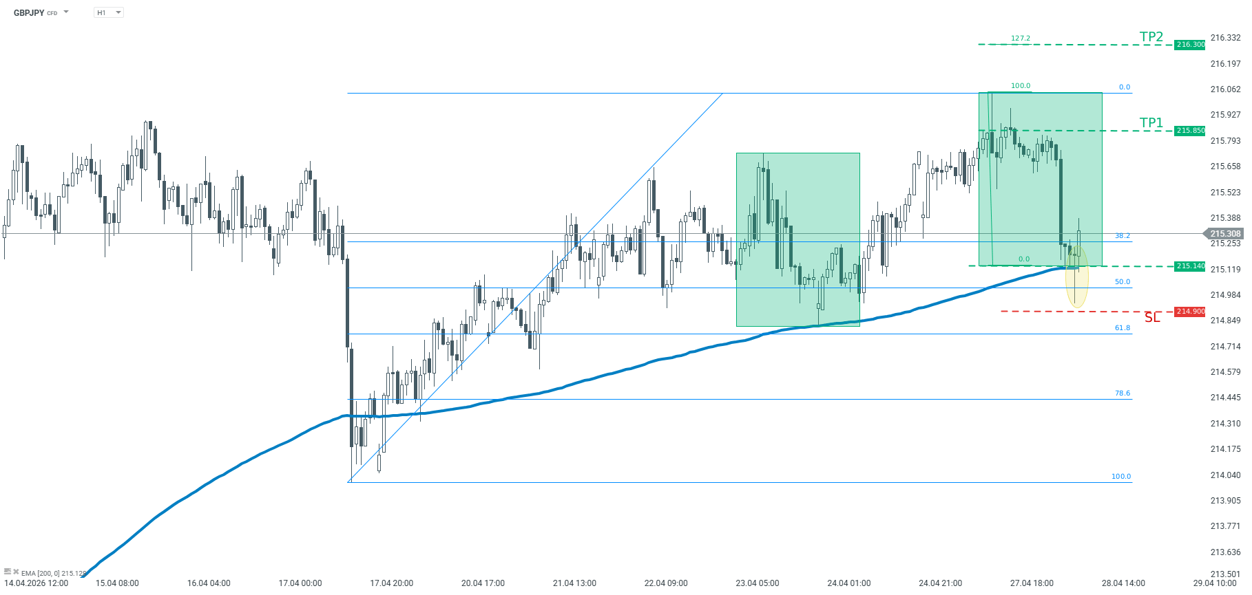 Trade: Long GBPJPY at market price Target: 215.85, 216.30 Stop: 214.90
